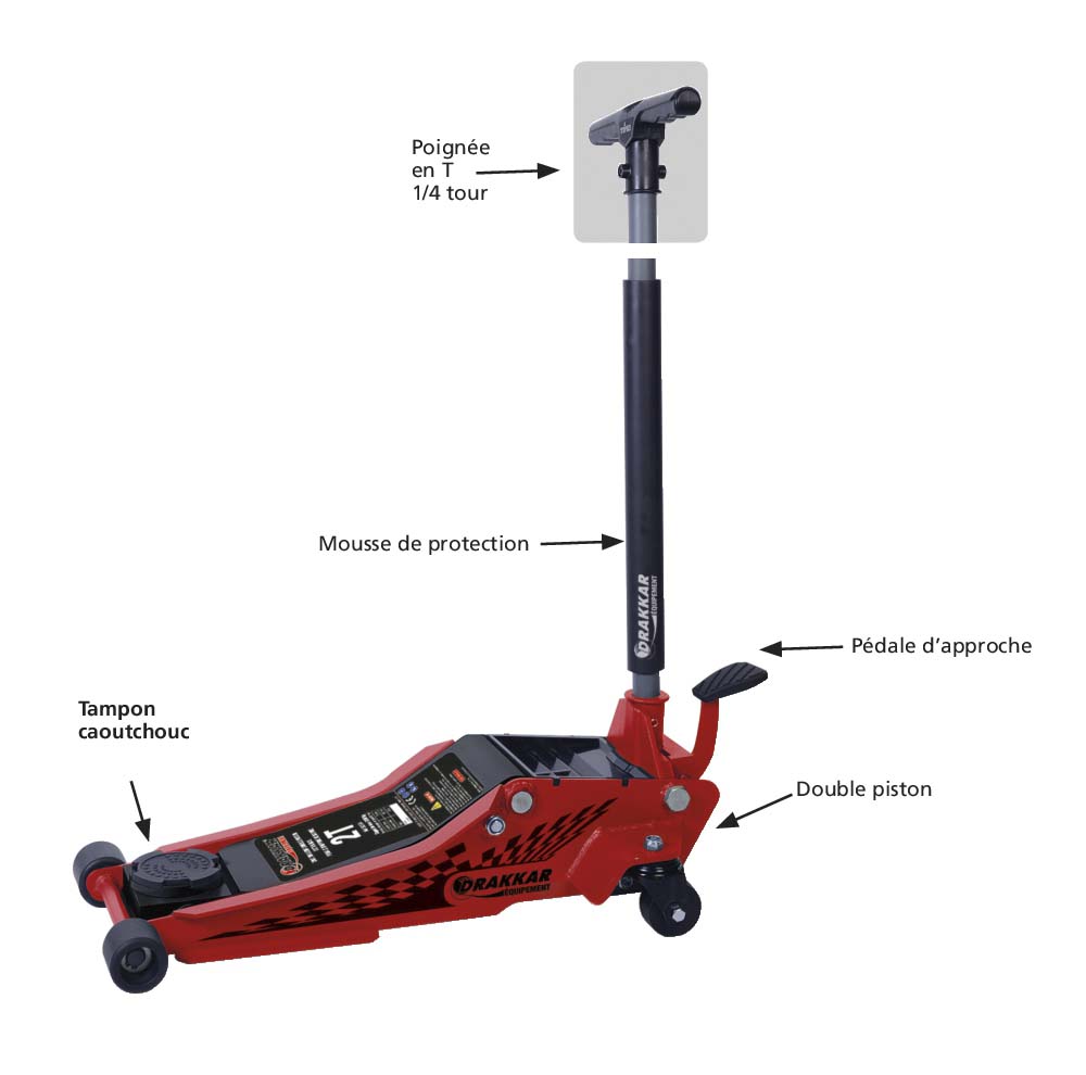 Cric rouleur 2t double piston + pédale roues nylon 75/500mm longueur 786mm surbaissé DRAKKAR EQUIPEMENT - 52524
