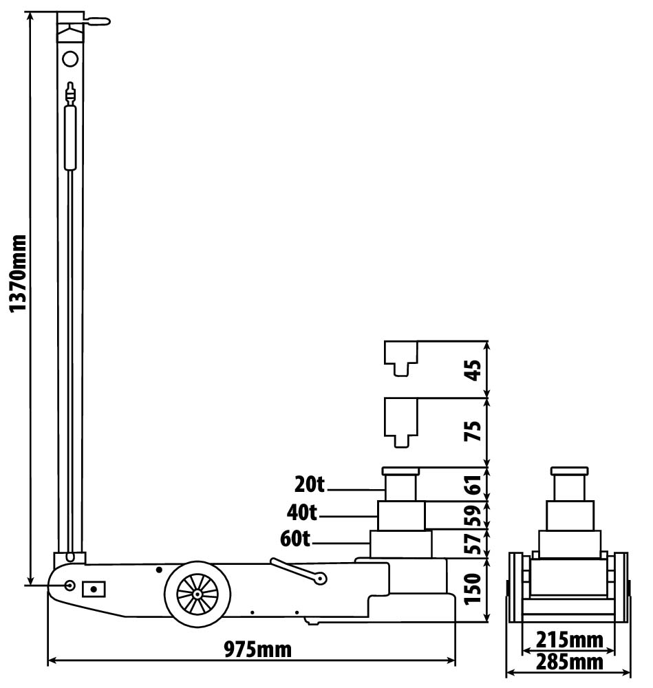 Pour un fonctionnement optimal, ce cric fonctionne sous une pression de 9 à 12 bars. Il est également équipé d'un manche ajustable à trois positions (0° - 45° - 90°) pour une flexibilité d'utilisation reconnue. De plus, deux rallonges de 45 mm et 75 mm sont incluses pour s'adapter à divers besoins de levage. Avec une hauteur minimale de 150 mm et une hauteur maximale de 447 mm, ce cric est conçu pour s'adapter aux différents espaces de travail tout en offrant une capacité de levage impressionnante de 60T.