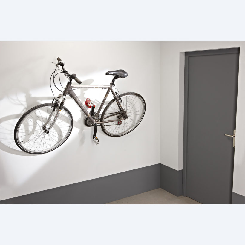 - Maintient le vélo plaqué contre le mur pour optimiser le rangement.