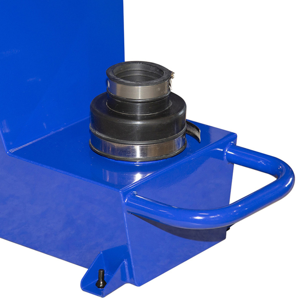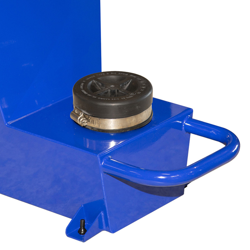 La cuve est montée sur roues, facilitant son déplacement sur le chantier ou en atelier. Elle est fournie avec un couvercle pour protéger le contenu et un support pour sac, assurant une utilisation pratique et efficace.
