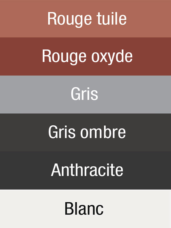 - Existe en 6 coloris : rouge tuile, rouge oxyde, gris, gris ombre, anthracite et blanc
