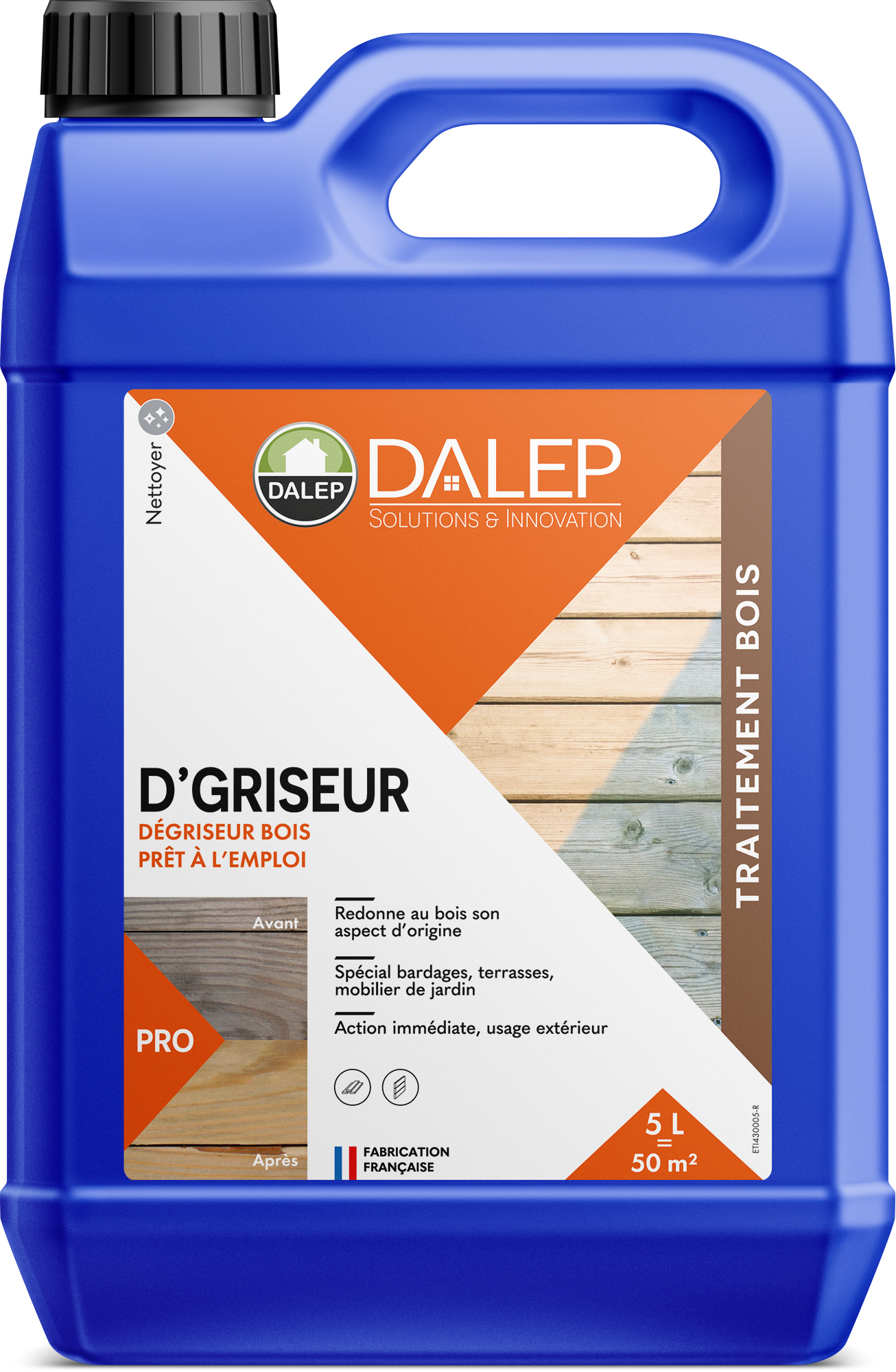 Adoptez le Dégriseur D'GRISEUR Bois DALEP pour tous vos projets de rénovation extérieure, et garantissez à votre bois une durabilité et un aspect qui sortent du lot.