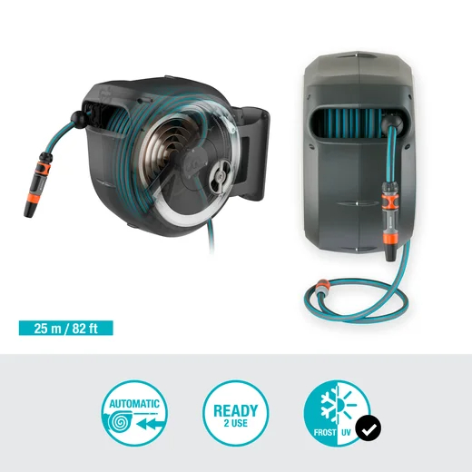 Avec le dévidoir automatique mural, votre tuyau d'arrosage reste toujours à portée de main. Les lances, pistolets d'arrosage et brosses de nettoyage peuvent être également accrochés au support mural.
