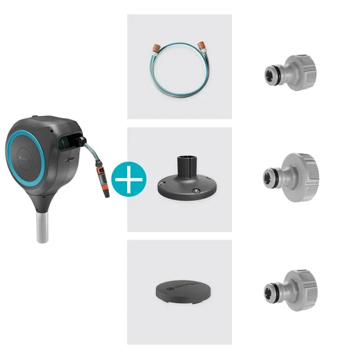 Le dévidoir inclut un tuyau d’arrosage de 20 m de haute qualité, idéal pour les jardins de taille moyenne, ainsi qu’un ensemble complet d’accessoires : un tuyau de raccordement flexible, des raccords de tuyau avec aquastop, une lance d’arrosage et de nettoyage, et un système de fixation universel comprenant vis et chevilles. Tous ces éléments sont prêts à l’emploi pour une expérience sans tracas dès l’installation.
