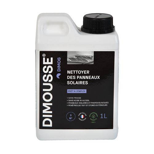 DIMOUSSE Nettoyant panneau photovoltaïque prêt à l’emploi s’applique sur tous les types de panneaux photovoltaïques et fenêtres de toits. DIMOUSSE Nettoyant panneau photovoltaïque prêt à l’emploi optimise le rendement des panneaux solaires en nettoyant toutes les salissures naturelles telles que les déjections d’oiseaux, poussières, lichens, mousses, feuilles, pollution industrielle et atmosphérique, Sans odeur, sans solvant et sans acide. Possède une formule exclusive permettant de limiter les traces grâce à ses propriétés déperlantes, Prêt à l’emploi est non corrosif et non agressif, il n’attaque ni les matériaux, ni les métaux, ni le verre.