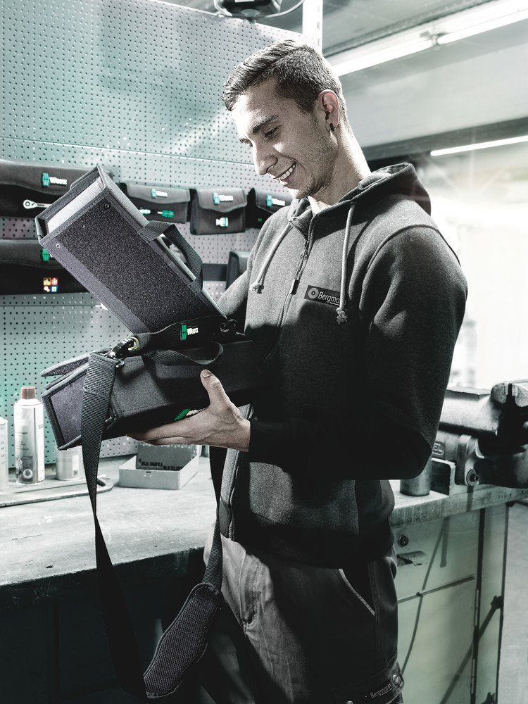 Grâce au système à bandes scratch, les composants du système Wera 2go tout comme les outils Wera logés dans des boîtes ou housses à bandes scratch peuvent être accrochés au dispositif porte-outils Wera 2go 1