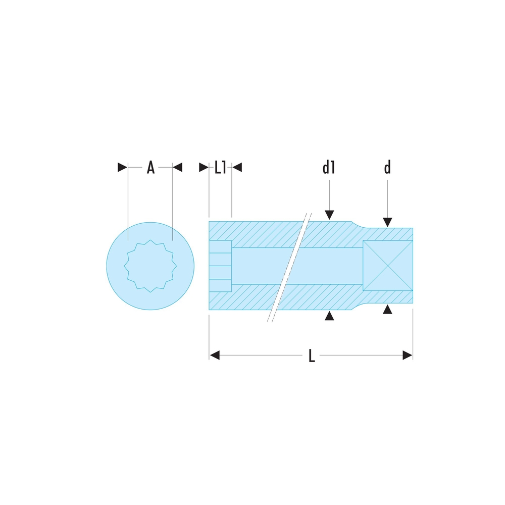 La douille est de type 12 pans, d’un diamètre de 30 mm, et est compatible avec une prise de 1/2". Sa finition chromée brillante lui confère une grande résistance à la corrosion et une esthétique soignée. Le modèle est également disponible en racks métalliques sous les références S.40E (8 à 16 mm) et S.41E (17 à 24 mm), ce qui facilite son rangement et son accès.