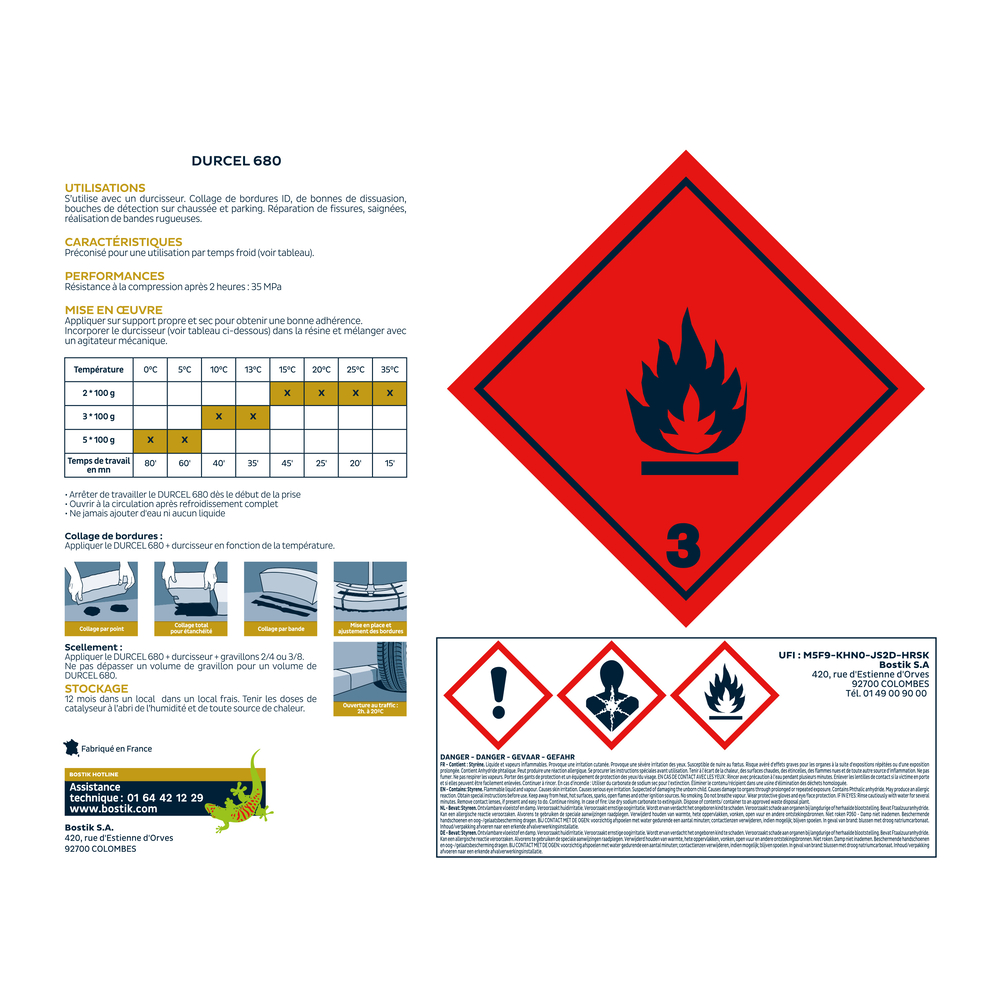 Le Durcel 680 se distingue par son absence de retrait lors du durcissement, garantissant une fixation solide. Sa formulation offre une excellente résistance à l’eau, aux huiles et aux produits chimiques, tout en présentant une très haute résistance à l’abrasion. Ce mélange de robustesse et de durabilité en fait un choix judicieux pour des applications nécessitant une performance accrue.