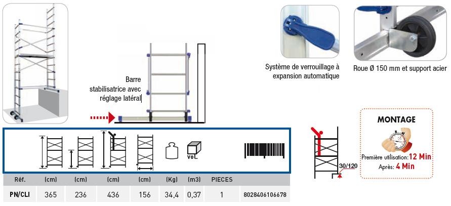 L'échafaudage aluminium FACAL PINNACLIC offre une solution robuste et légère, idéale pour les chantiers nécessitant un matériel fiable et facile à monter. Fabriqué en Italie, il permet une hauteur de travail de 4,36 m avec une charge maximale admissible de 150 kg sur l'ensemble de la structure et sur chaque plancher.