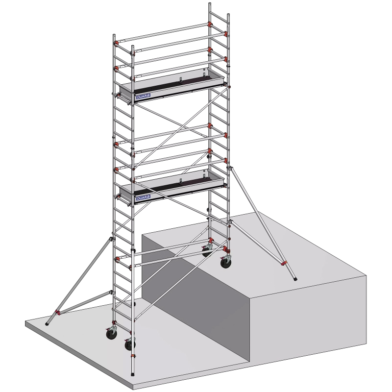 Cet échafaudage est idéal pour les professionnels recherchant un équipement robuste, sécurisé et facile à manipuler, adapté aux différents environnements de chantier, notamment en intérieur et sur sols présentant des dénivelés modérés.