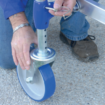 Ses plinthes de 150 mm en aluminium amovibles sont rapides à mettre en place, sans vis ni outils. Ses roues de 200 mm de diamètre sont réglables sur 175 mm et tous les 12,5 mm. Il répond à la norme EN 1004-1 et au décret 2004-924.