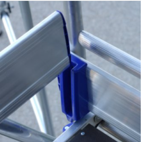 La liaison des garde-corps est originale, très simple et sûre. La partie haute s’accroche sur les échelons avec des pièces en aluminium moulé, forte épaisseur. Les deux diagonales viennent prendre en tenaille le montant. Le système «Ergoblock®» se referme d’une main et peut se régler pour assurer le meilleur serrage.