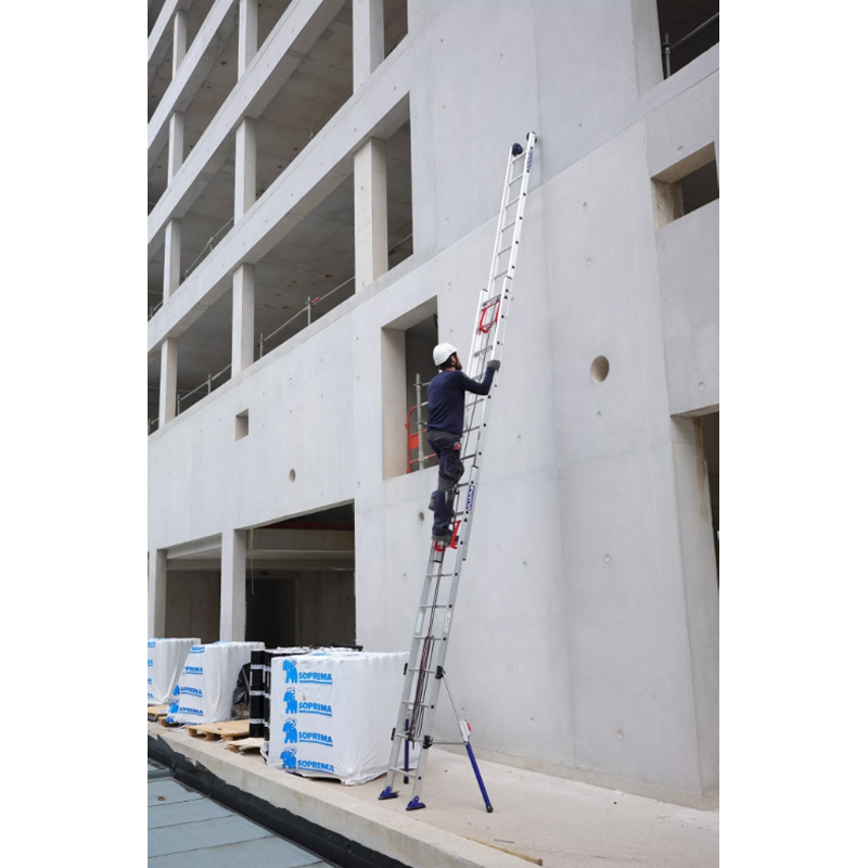 Échelle coulissante C3 STAB avec accès optimisé pour façades de bâtiments, dotée de stabilisateurs rabattables précisément ajustables. Ses patins larges et articulés possèdent une semelle antidérapante pour une stabilité et confort accrus. La manipulation est aisée et sans accroc grâce aux glissières avec guides en polyamide. Sécurité renforcée par un dispositif de descente contrôlée capable de supporter jusqu'à 350 kg. Complétée par des accessoires pour fixation et écartement mural, elle est fabriquée en France en aluminium de haute qualité, conforme à la norme EN 131 et labellisée NF, garantissant sa robustesse et fiabilité.