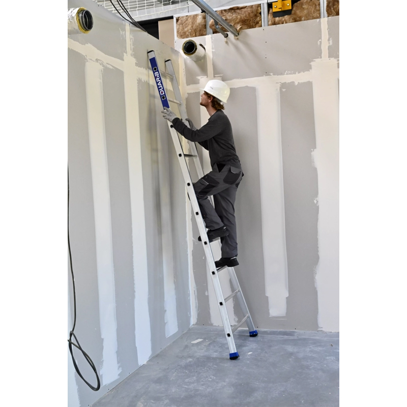 L’échelle simple SE MASTER DUARIB est conçue en aluminium avec une base évasée qui garantit une stabilité accrue lors de son utilisation. Conforme à la norme EN 131 et labellisée NF, elle supporte une charge maximale de 150 kg et est assemblée par sertissage pour une solidité renforcée. Ses patins chaussants antidérapants assurent une excellente adhérence au sol tandis que ses barreaux légèrement arrondis, également antidérapants, offrent un confort supérieur à l’utilisateur. Cette échelle comporte dix barreaux, mesure 2,95 m de longueur et permet une hauteur d’accès maximale d’environ 3,85 m, calculée en fonction de la taille de l’utilisateur avec les bras levés. Sa largeur est de 0,73 m, avec des profils de montants de 57 mm qui contribuent à sa robustesse et sa stabilité.