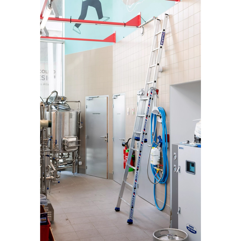 L’échelle est compatible avec des accessoires tels que l’attache-échelles pour galerie et l’écarteur de mur télescopique, facilitant son adaptation à divers besoins.