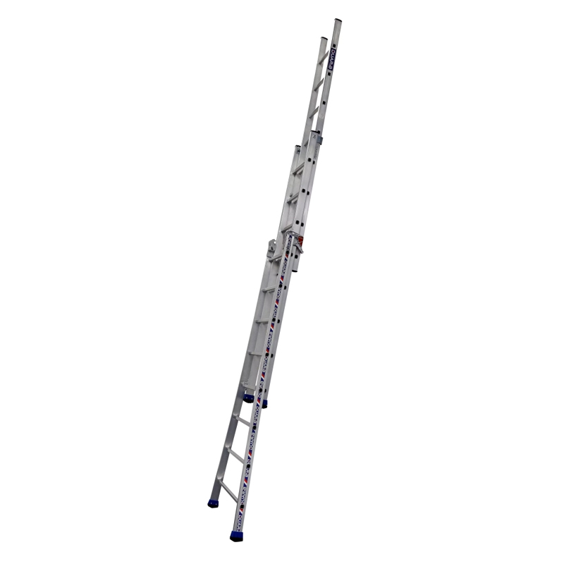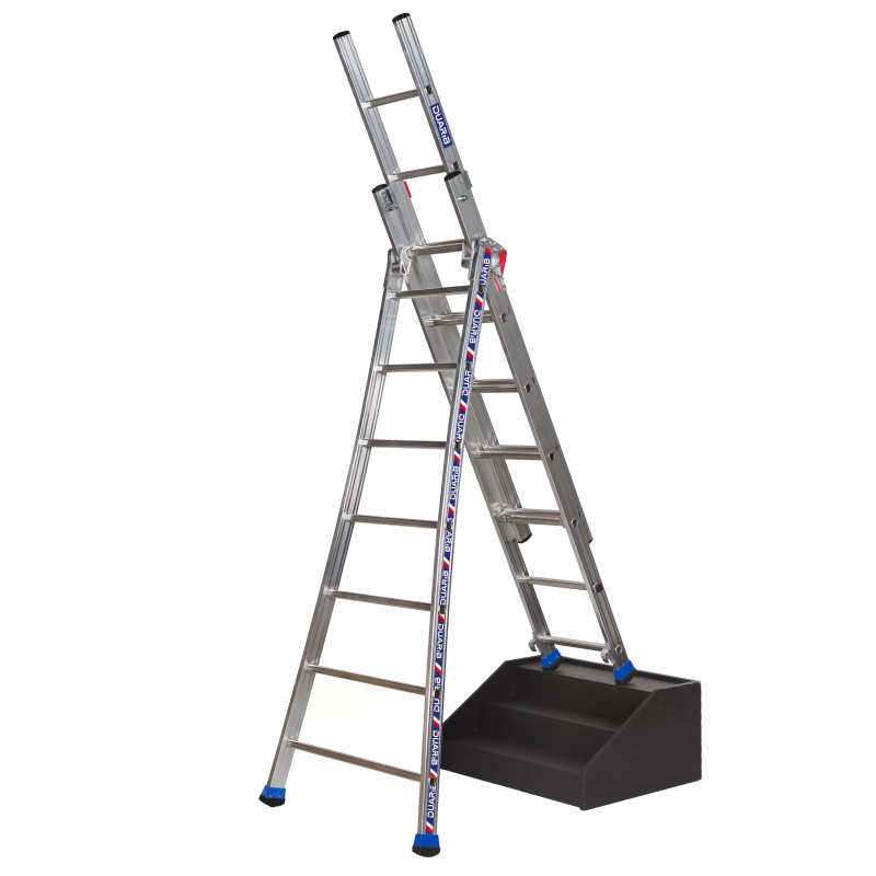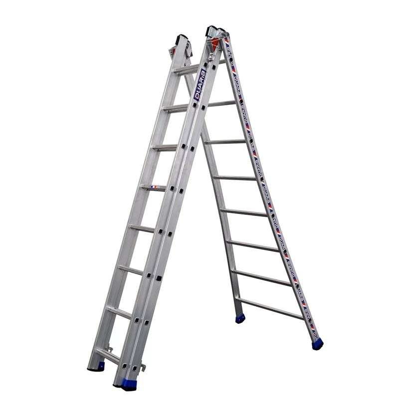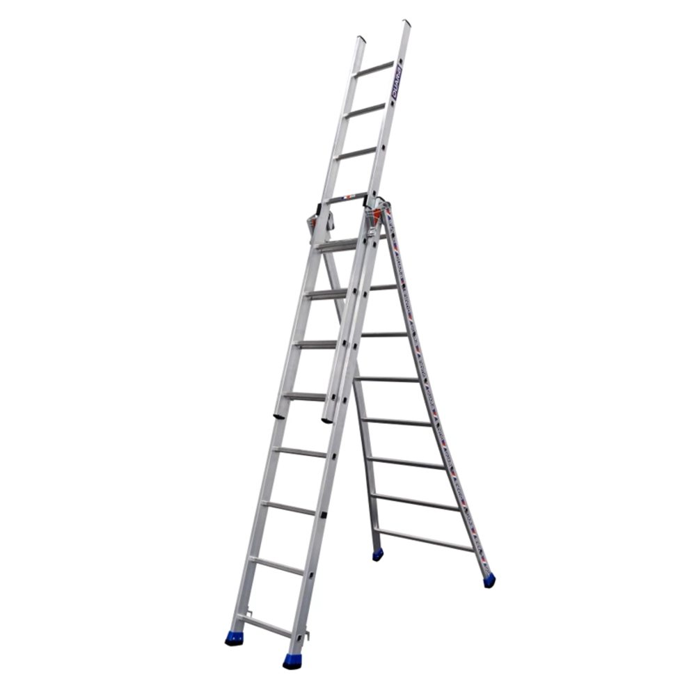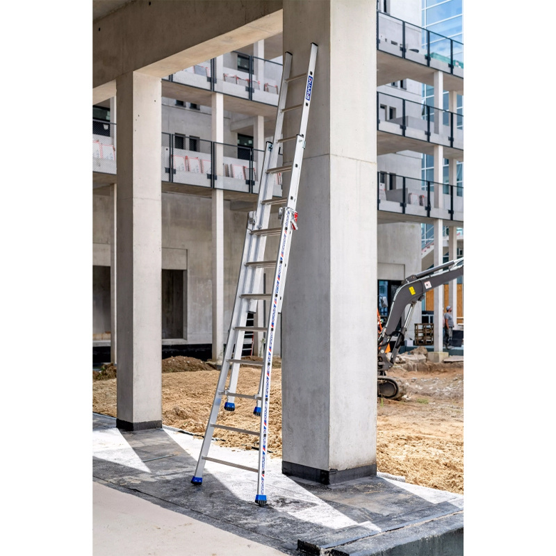 L’échelle transformable à base évasée 3 plans DUARIB MASTER T3 allie robustesse et praticité pour répondre aux exigences des professionnels. Son articulation vissée au profil, associée à un axe de guidage intégré, facilite grandement l’ouverture et la manipulation des plans, tandis que les cales en polypropylène garantissent un coulissement fluide et sans effort. La stabilité est assurée par une base évasée renforcée et de larges patins antidérapants qui sécurisent chaque appui. Le verrou de sécurité sur le crochet de réglage de la hauteur offre une protection supplémentaire lors de l’utilisation. Conçue en aluminium avec de larges profils fermés assemblés par sertissage, cette échelle supporte une charge maximale de 150 kg, conforme à la norme EN 131 et labellisée NF, attestant de sa qualité et fiabilité. Elle peut être équipée d’accessoires tels que l’attache échelles ou l’écarteur de mur pour s’adapter à différents usages. Fabriquée en France et garantie 10 ans, elle mesure 2,20 mètres une fois repliée et atteint 4,70 mètres en position dépliée maximale. Sa hauteur d’accès varie selon la position : jusqu’à 5,50 mètres en échelle d’appui, 3,50 mètres en position autostable, et 4 mètres en position autostable aérienne. Avec une largeur de 0,81 mètre et des profils de montants de 70 mm, elle combine légèreté et solidité pour un usage sûr et confortable.