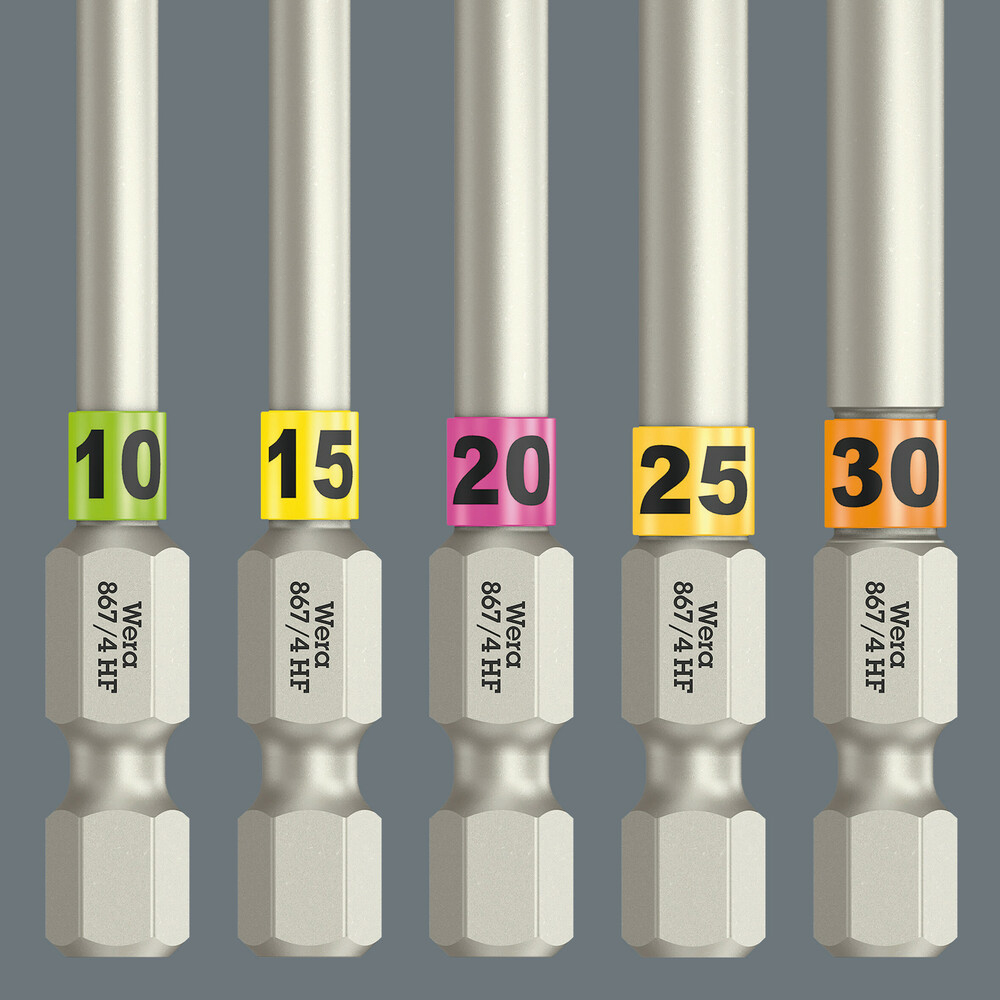 Embouts haut de gamme pour vis à empreinte TORX®. Les outils TORX® HF (HF = fonction de retenue) développés par Wera se distinguent par une optimisation géométrique du profil TORX® initial. La force de blocage résultant de la pression superficielle s'exerçant entre la pointe d'entraînement et le profil des vis permet le maintien sûr de ces dernières sur l'outil ! Convient aussi aux vis Würth ASSY et aux vis Altenloh SPAX T-STAR plus. Repéreur d'outils "Take it easy" avec code couleur en fonction de la taille. Hexagone 1/4" pour porte-embouts selon DIN ISO 1173-F 6,3.