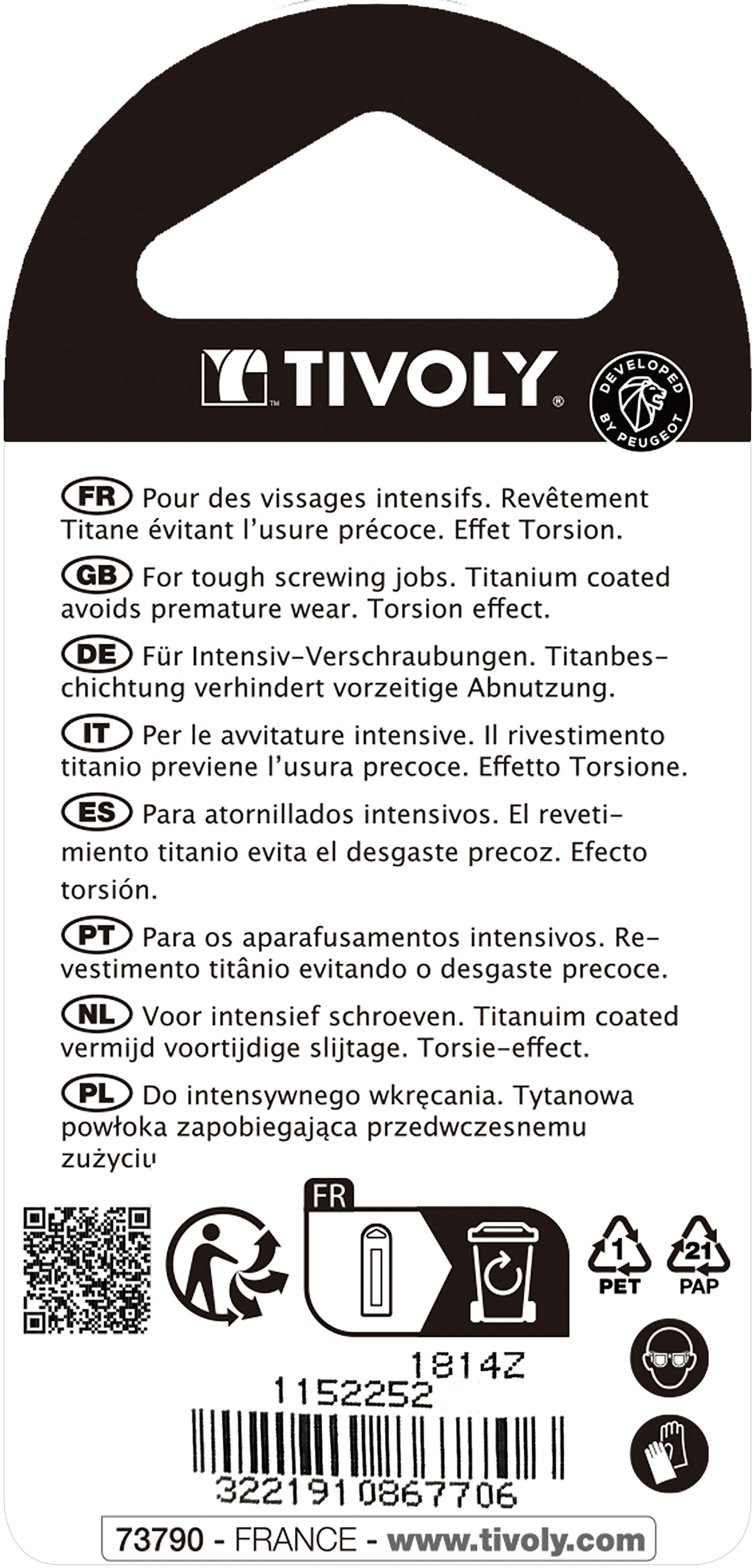 Pour une utilisation optimale, il est recommandé de l'associer à des vis Torx, ce qui permettra de maximiser l'effet Torsion. Ce dernier assure une meilleure transmission de force, facilitant ainsi le vissage et réduisant l'effort nécessaire.