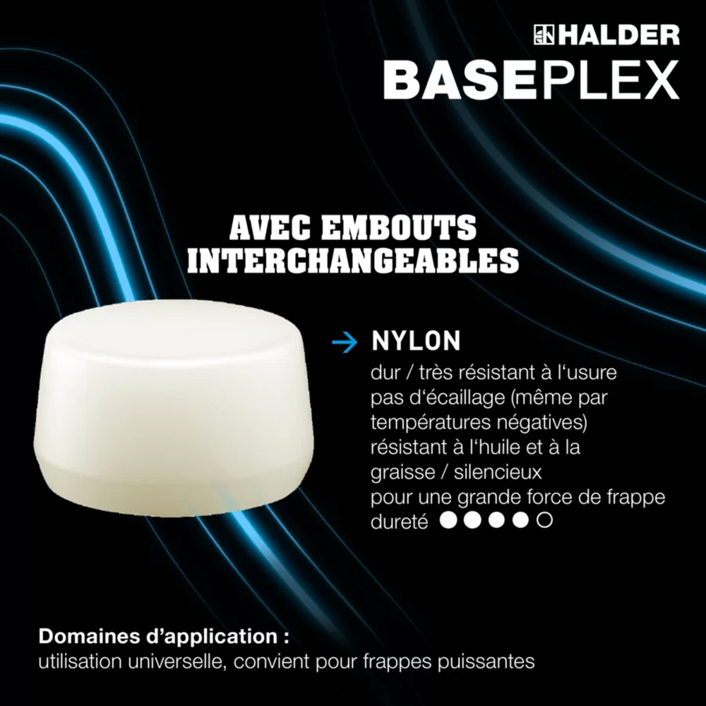 L'embout BASEPLEX, fabriqué en nylon de série 3988, se distingue par sa dureté d'environ 75 Shore D, garantissant ainsi une robustesse supérieure. Il est spécialement conçu pour résister à l'usure, et est aussi efficace contre l'huile et la graisse, ce qui le rend adapté à de nombreux environnements de travail. Utilisez-le pour des applications nécessitant une finition lisse et résistante.