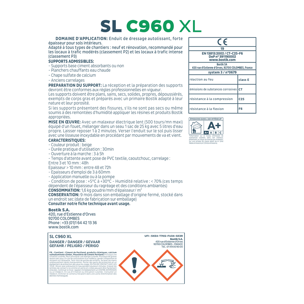 L'enduit de dressage de sol SL C960 XL de Bostik est un produit de finition de haute qualité en sac de 25 kg.