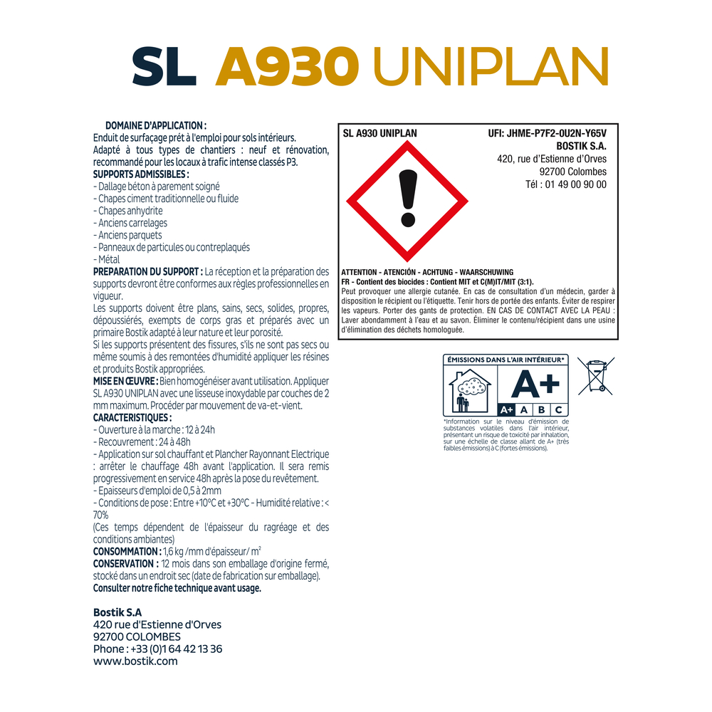 L'Enduit de lissage en pâte SL A930 Uniplan gris ciment de Bostik est un produit prêt à l’emploi, conçu pour offrir une finition lisse et uniforme.