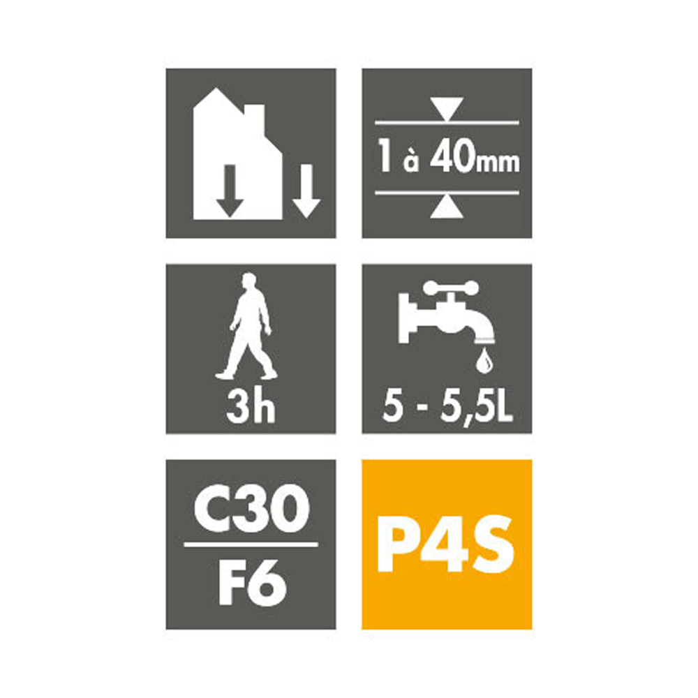 Classé P4, cet enduit est adapté pour des épaisseurs allant de 3 à 40 mm, selon la nature des supports. Il présente également des caractéristiques mécaniques élevées, garantissant durabilité et résistance. Cet enduit est compatible avec tous types de planchers chauffants, qu'ils soient réversibles ou PRE, en faisant un choix idéal pour vos installations intérieures et extérieures.