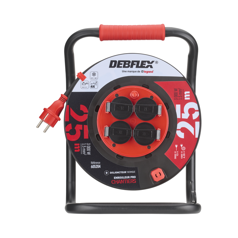 Découvrez ENROULEUR HO5RR-F PLASTIC 3G1,5 CENTRE FIXE 4 PRISES ETANCHE IP44 25M - DEBFLEX - 605204 disponible à l'achat