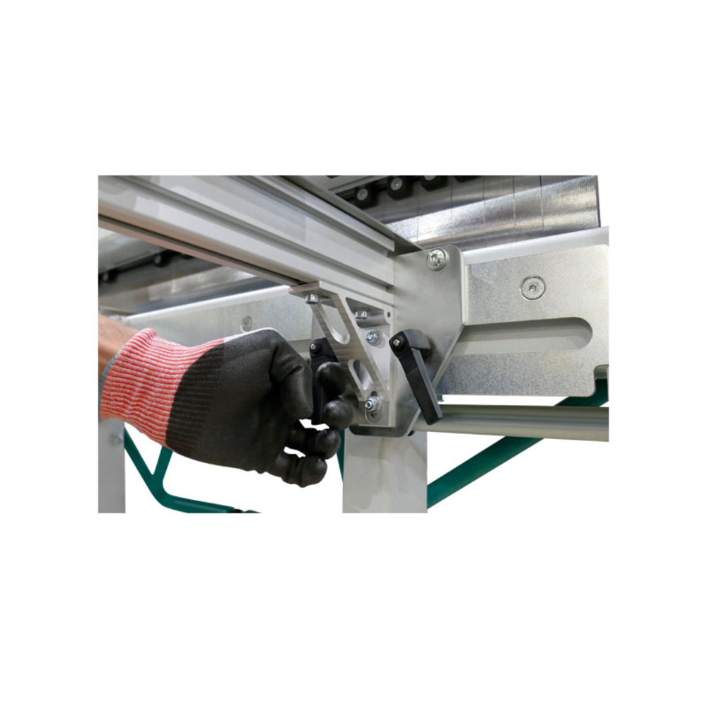 Ces butées arrières facilitent la manipulation et le positionnement des matériaux lors de l’utilisation de la plieuse. Elles sont essentielles pour garantir des pliages précis et uniformes. Pour un fonctionnement optimal, assurez-vous d’effectuer un alignement correct avec les repères de la machine.