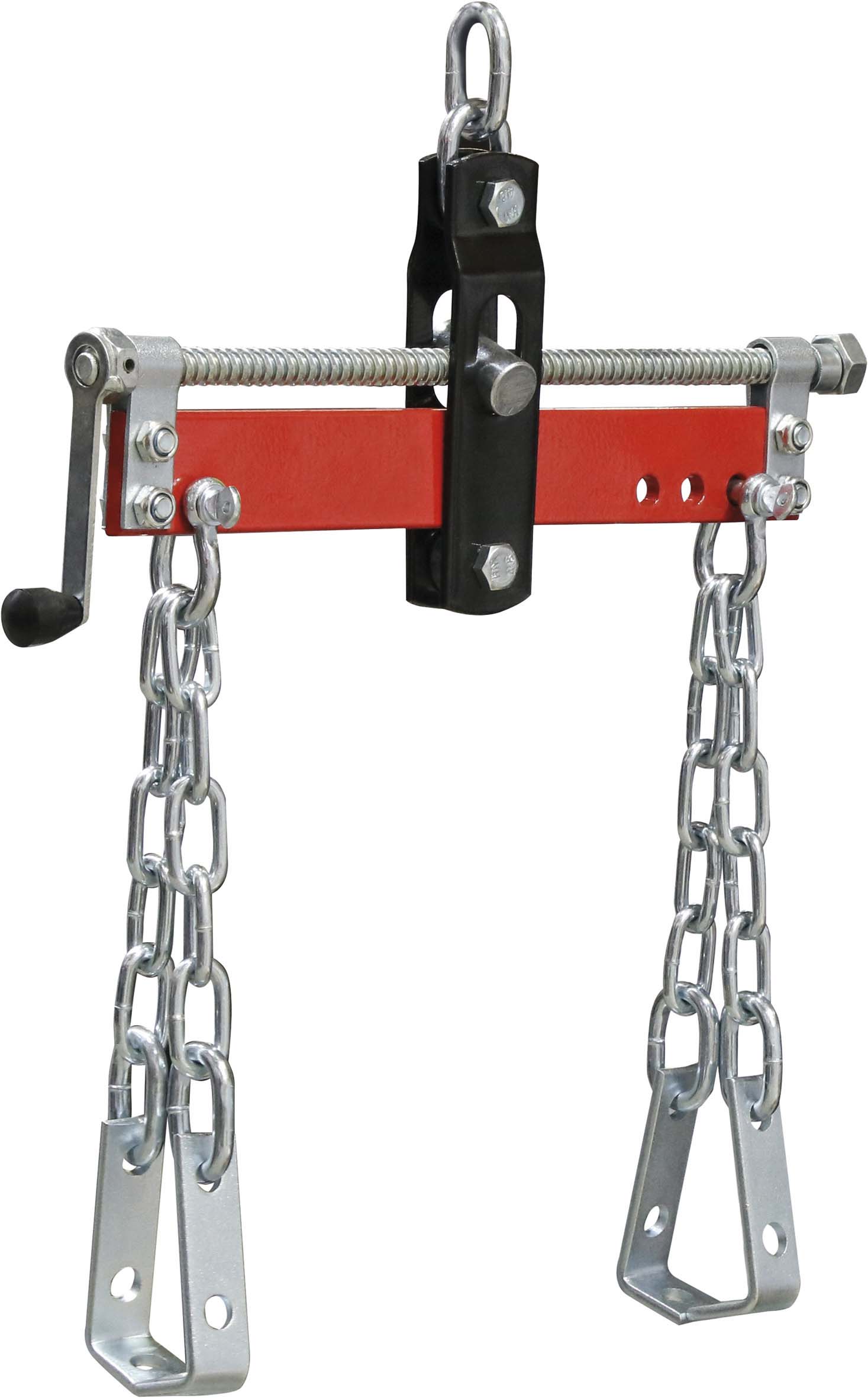 Equipé de 4 chaînes avec crochets de suspension, d'une vis sans fin actionnée par une manivelle.
