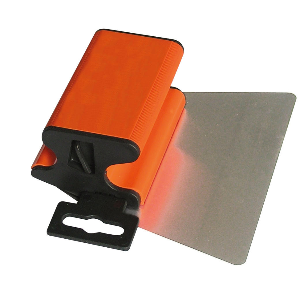 L'outil est doté d'un crochet de suspension pour un rangement pratique. La lame est entièrement dégagée et pliée pour conjuguer rectitude et souplesse, garantissant un lissage de qualité. Le nettoyage est facile et la lame est interchangeable grâce à une clé de serrage intégrée à l'outil.