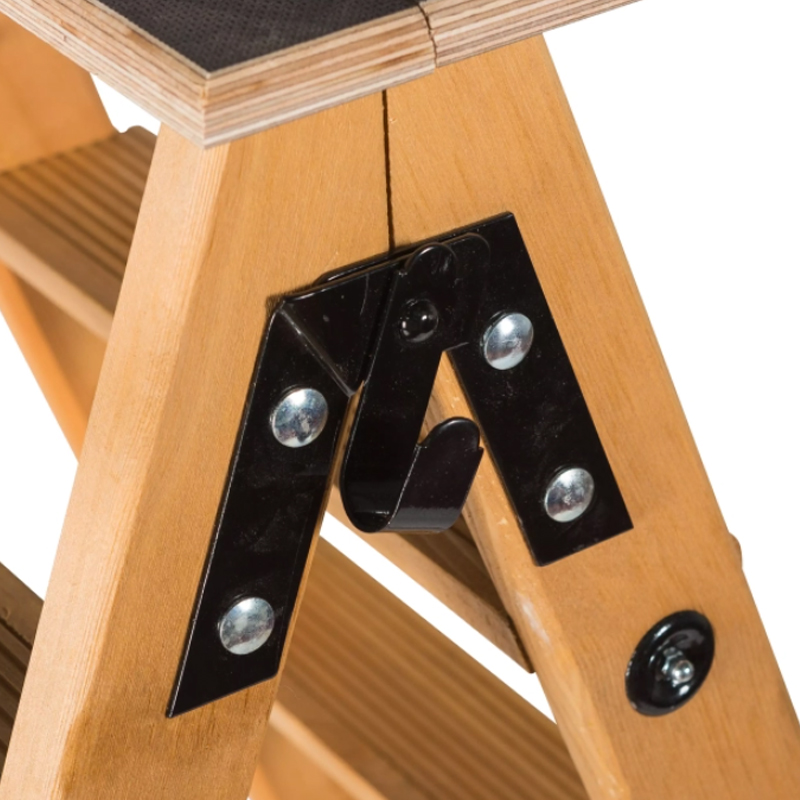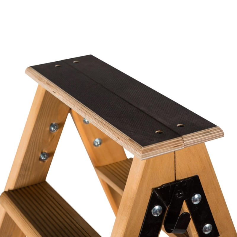 Escabeau à double accès en bois, doté de deux fois cinq marches et d'une tablette pratique. Il est traité avec une finition lasure pour une protection efficace contre les UV. Sa capacité de charge maximale est de 150 Kg, garantissant une utilisation sûre. Lorsqu'il est replié, sa longueur est de 1,41 m, facilitant son rangement. La hauteur d'accès maximale, calculée en ajoutant votre taille avec les bras levés à la hauteur du dernier barreau autorisé, atteint 2,65 m. Son empattement au sol est de 1,32 m pour une stabilité optimale, et il présente une largeur de 0,51 m. Les montants de l'escabeau ont un profil de 65/65, assurant une solidité et une durabilité accrues.