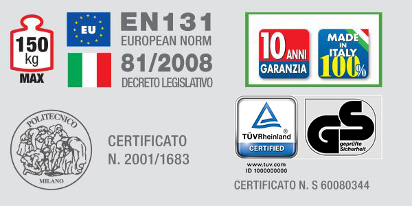 L’escabeau est conforme à la norme européenne EN131 et bénéficie de certifications TÜV Rheinland, GS et TÜV Nederland. Il est garanti 10 ans et fabriqué en Italie.