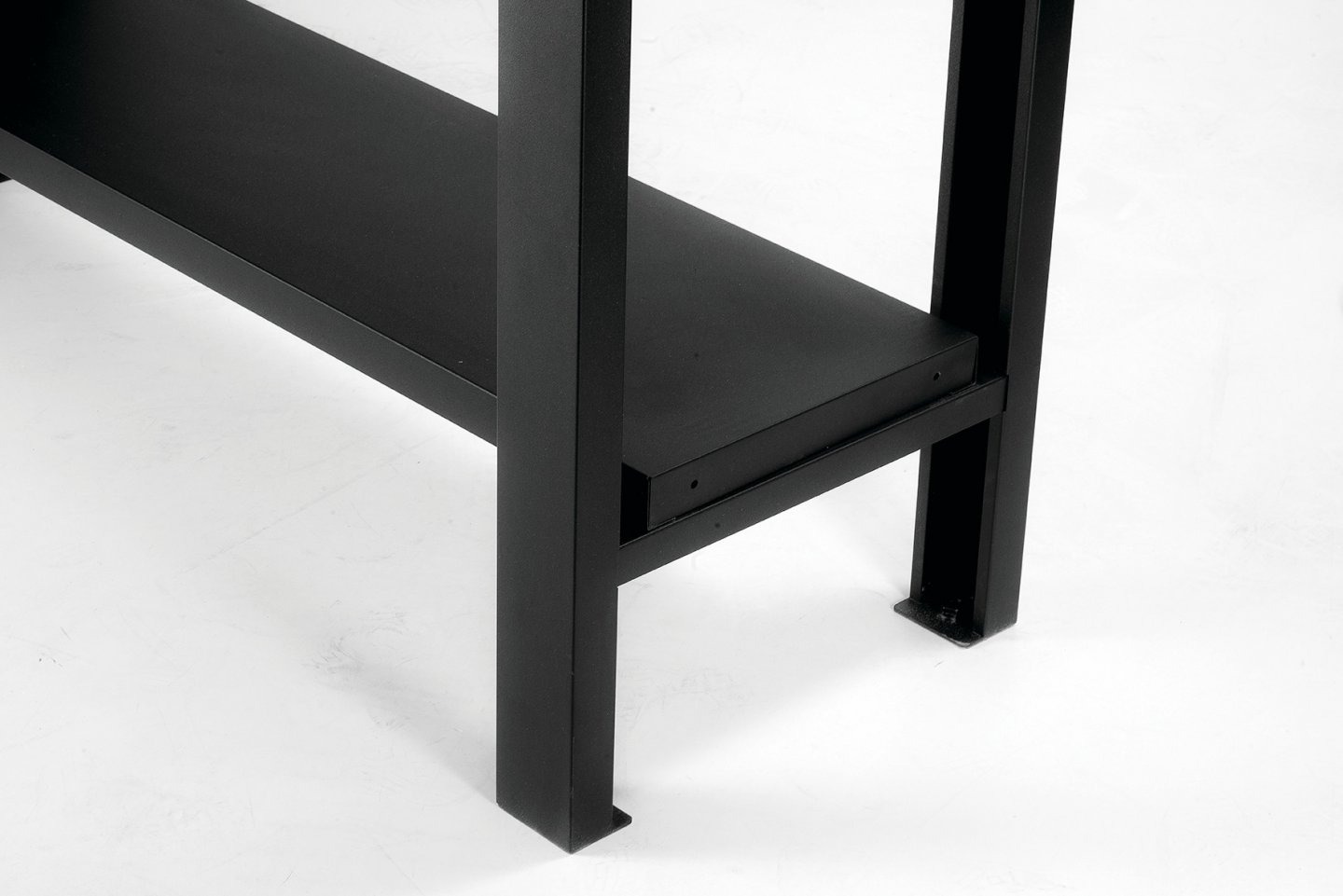 Cet établi est également équipé d'une plaque en acier inoxydable, idéale pour les frappes fortes, et peut être positionnée à gauche ou à droite du plateau selon les préférences de l'utilisateur. Il dispose également d'une traverse métallique qui peut servir d'étagère de rangement inférieure, offrant ainsi un espace supplémentaire pour l'organisation des outils. La peinture époxy assure une finition résistante et durable, et une fixation au sol est possible pour renforcer la stabilité.