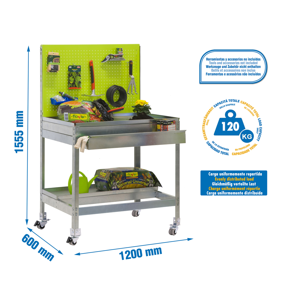 Les dimensions de l'établi sont de 1520 mm de long, 1200 mm de large et 600 mm de haut, offrant un espace de travail généreux. Chaque niveau peut supporter jusqu'à 120 kg, assurant une robustesse adaptée à une utilisation régulière. Sa conception pratique et fonctionnelle en fait un atout précieux pour vos activités de jardinage.
