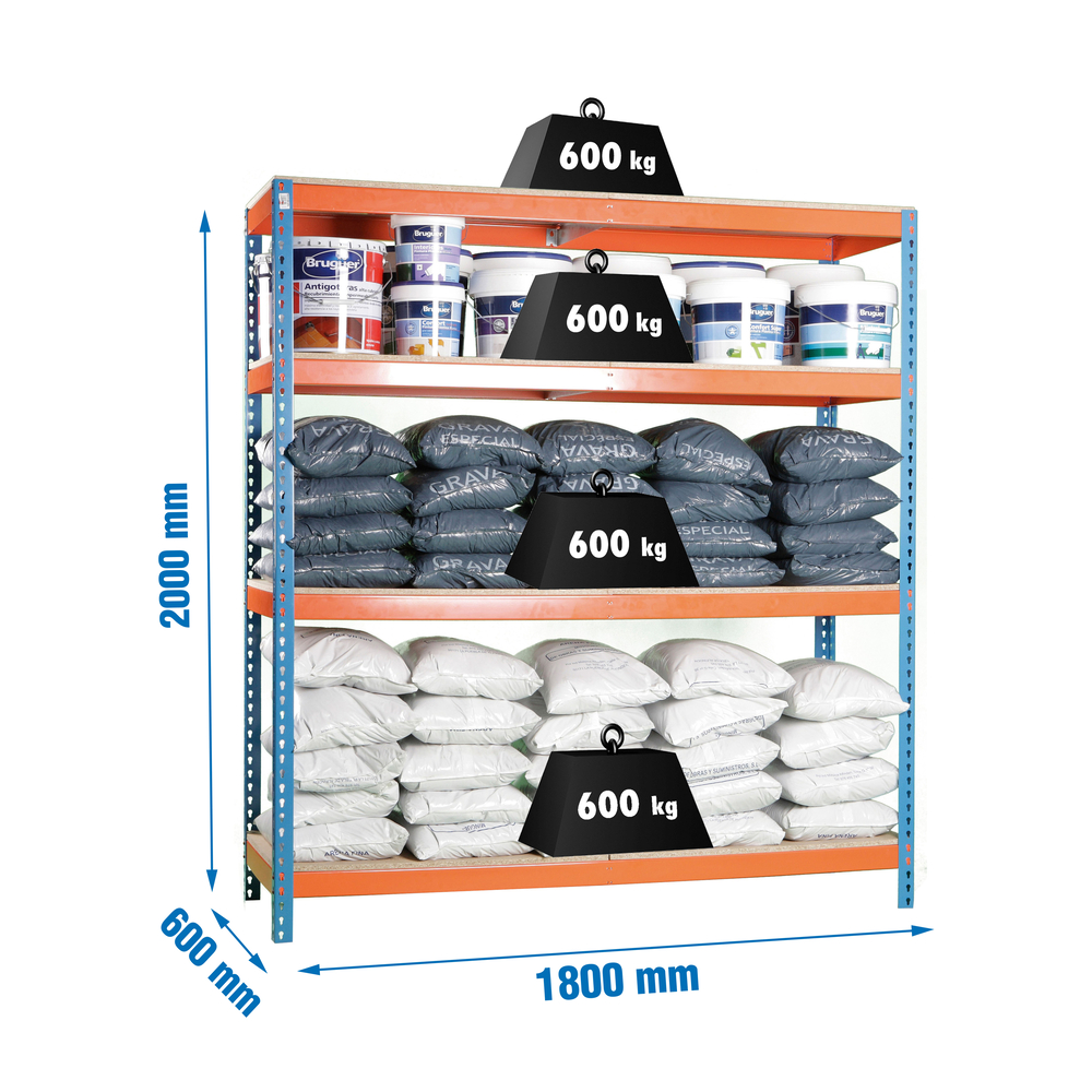 Les dimensions de l'étagère sont de 2000 x 1800 x 600 mm et elle se compose de 4 niveaux. Chaque niveau peut supporter jusqu'à 600 kg, équipé de plats en aggloméré de 12 mm d'épaisseur. En utilisation, les dimensions sont légèrement ajustées à 1975 x 1810 x 610 mm. Éléments de qualité européenne, cette étagère répond aux normes strictes et assurera une durabilité à long terme.