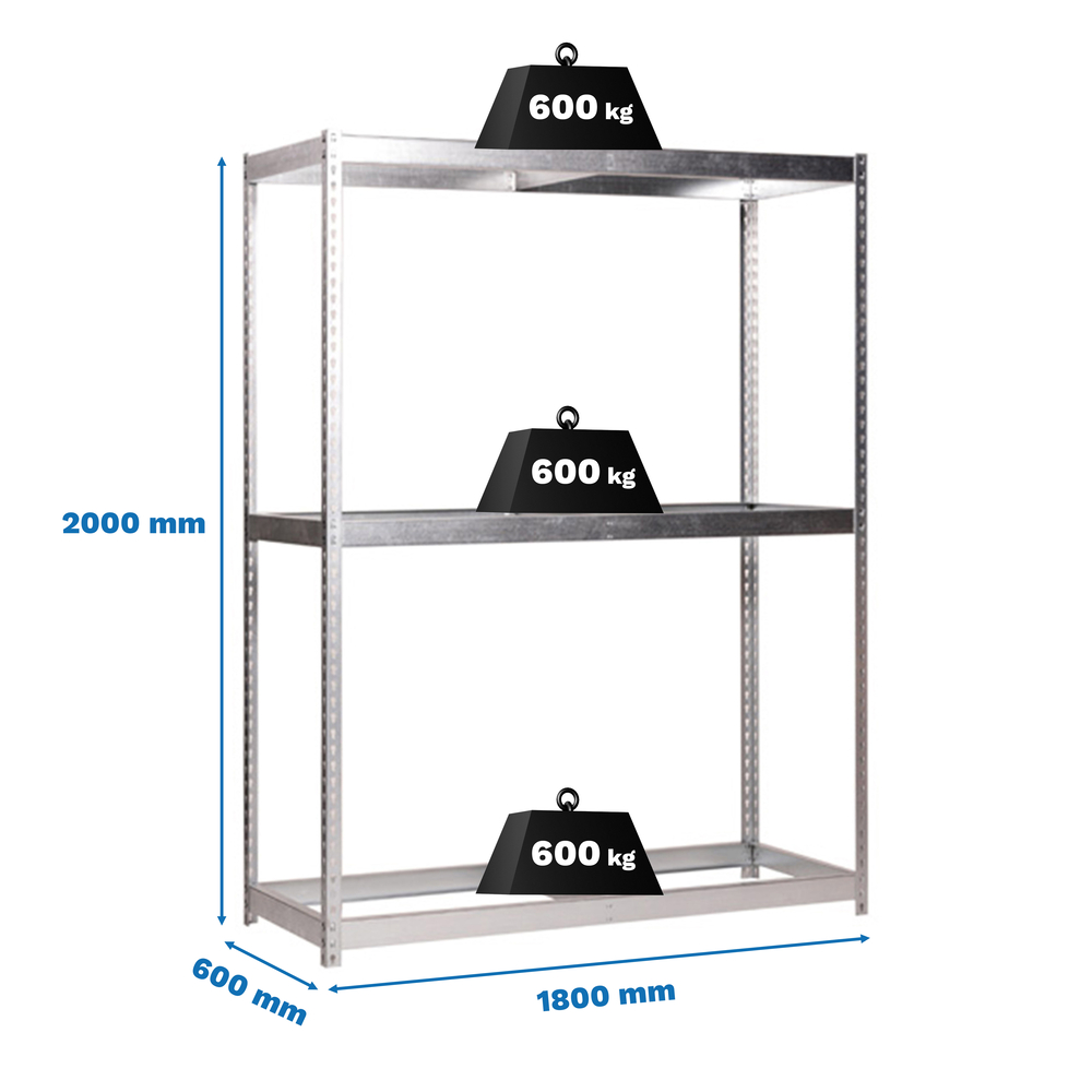 Cette étagère a des dimensions de 2000 mm de haut, 1800 mm de large et 600 mm de profondeur. Chaque niveau peut supporter jusqu'à 600 kg, offrant ainsi une capacité de charge totale impressionnante. Notez qu'aucun plateau n'est inclus, ce qui permet de personnaliser l'utilisation de chaque niveau selon vos besoins spécifiques.