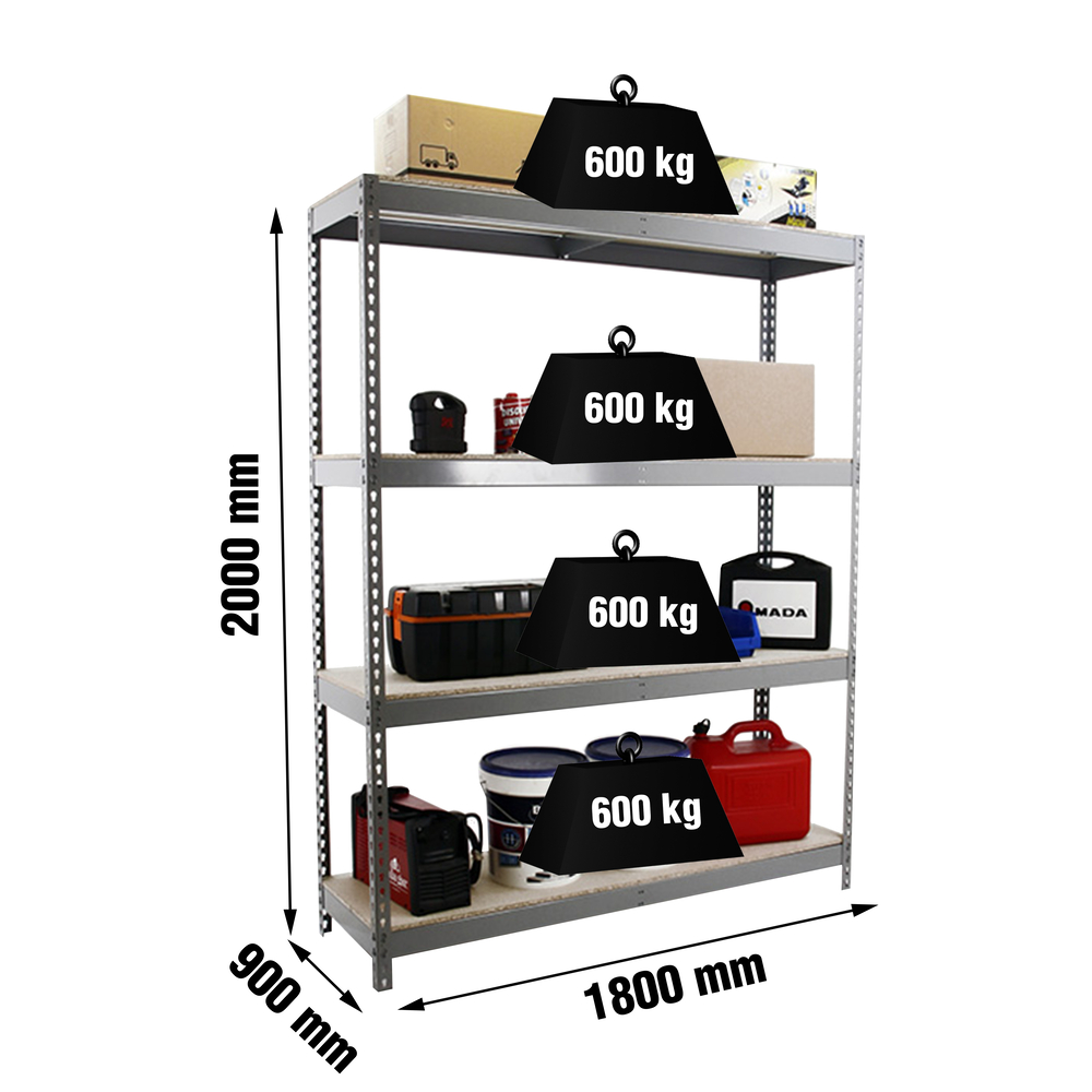 Avec des dimensions de 2000x1800x900 mm, chaque niveau supporte jusqu'à 600 kg, pour une capacité totale impressionnante de 2400 kg. Fabriquée en Europe, elle dispose de 8 étagères en aggloméré, deux par niveau, dont l'une est plus longue, assurant une utilisation maximale de l'espace. Ce modèle est conçu pour garantir une résistance à la flexion et non à la rupture, avec un renfort pour chaque hauteur. Sa finition gris et bois s'intègre harmonieusement dans divers environnements.