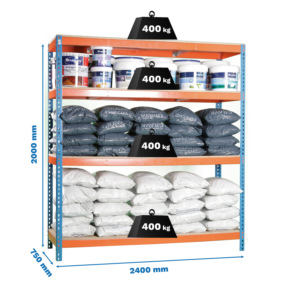Étagère charge moyenne 500 à 600kg - 2000x2400x750 - 4 niveaux Bleu/Orange/Bois - SIMON RACK - 8435104990650