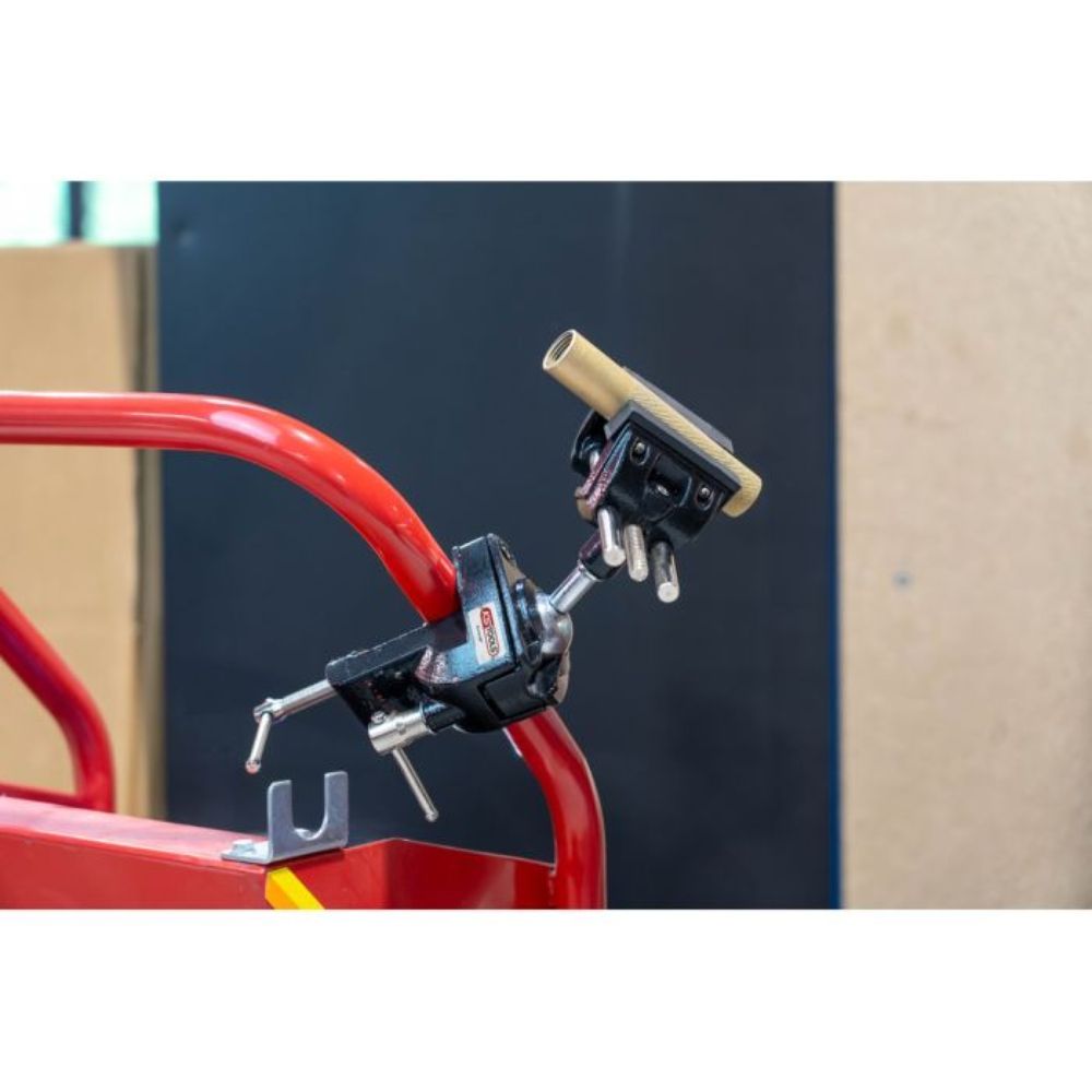 Cet étau est doté d'une base à double verrouillage et d'une rotule orientable à 360°, ce qui permet une grande flexibilité lors de l'utilisation. Il se fixe facilement sur tout plan de travail jusqu'à 55 mm d'épaisseur et peut également être fixé sur des tubes, offrant des options d'installation variées.
