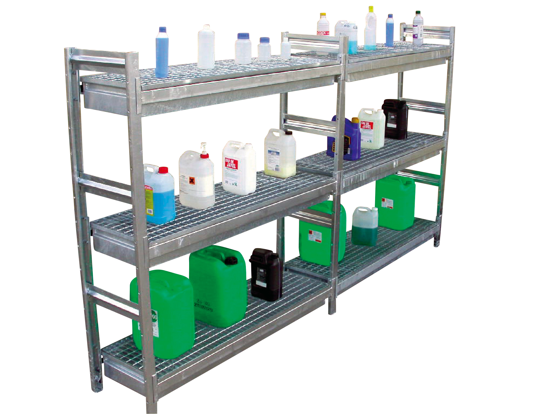 Idéal pour le stockage en rétention de bidons et petits fûts de produits chimiques, pétroliers, phytosanitaires… Acier galvanisé à chaud après soudures suivant la norme EN ISO 1461. Etagère 1 seul montant, vient s'accrocher au montant d'une autre étagère. 3 niveaux de bacs de rétention de 100 L chacun. Peut supporter 320 kg de charge par étage et chacun est muni d'un fer plat en partie arrière pour éviter la chute des articles.