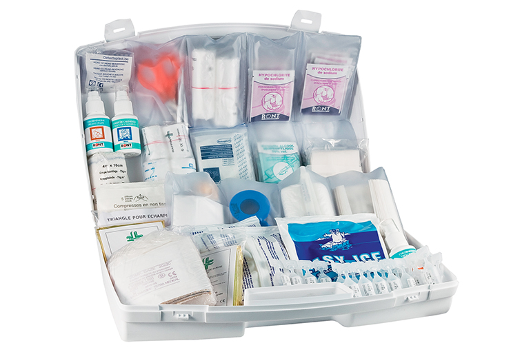 Composition : 1 kit coussin hémostatique 1 masque bouche à bouche 2 couvertures de survie 1 écharpe triangulaire 50 pansements adhésifs 20 mm x 72 mm 20 pansements adhésifs 53 mm x 70 mm 20 pansements adhésifs 10 cm x 6 cm 1 pansement à découper 1 m x 6 cm 4 pansements compressifs stériles 40 compresses stériles individuelles 20 cm x 20 cm 4 sachets de 5 compresses non tissées stériles 7.5 cm x 7.5 cm 4 bandes extensibles de 3 m x 5 cm 4 bandes extensibles de 3 m x 7 cm 4 bandes extensibles de 3 m x 10 cm 1 bande de crêpe de 4 m x 5 cm 1 bande de crêpe de 4 m x 10 cm 2 rouleaux de sparadrap sécables 5 m x 2 cm 2 paires de ciseaux 13 cm à bouts ronds 2 pinces à échardes à mors plats 5 paires de gants jetables 12 épingles de sûreté 2 pulvérisateurs de 50 ml de solution nettoyante à la chlorhexidine 1 pulvérisateur de 50 ml de solution anti-coups au calendula 15 compresses d’alcool à 70 ° 15 compresses de solution asséchante 3 packs de froid instantané 6 sachets de gel décontaminant mains sans eau 20 dosettes de sérum physiologique stérile 3 lots de 2 tampons hémostatiques pour le nez 1 livret premiers soins en 10 langues