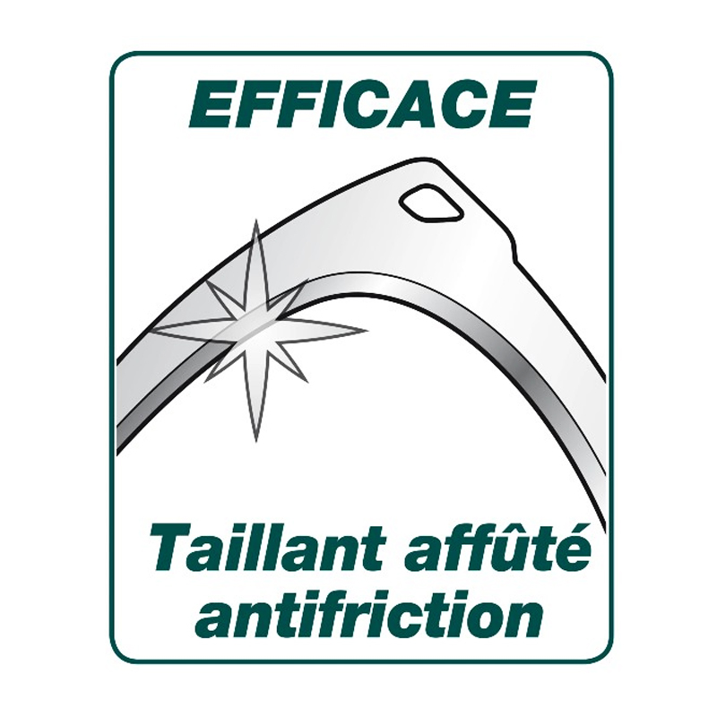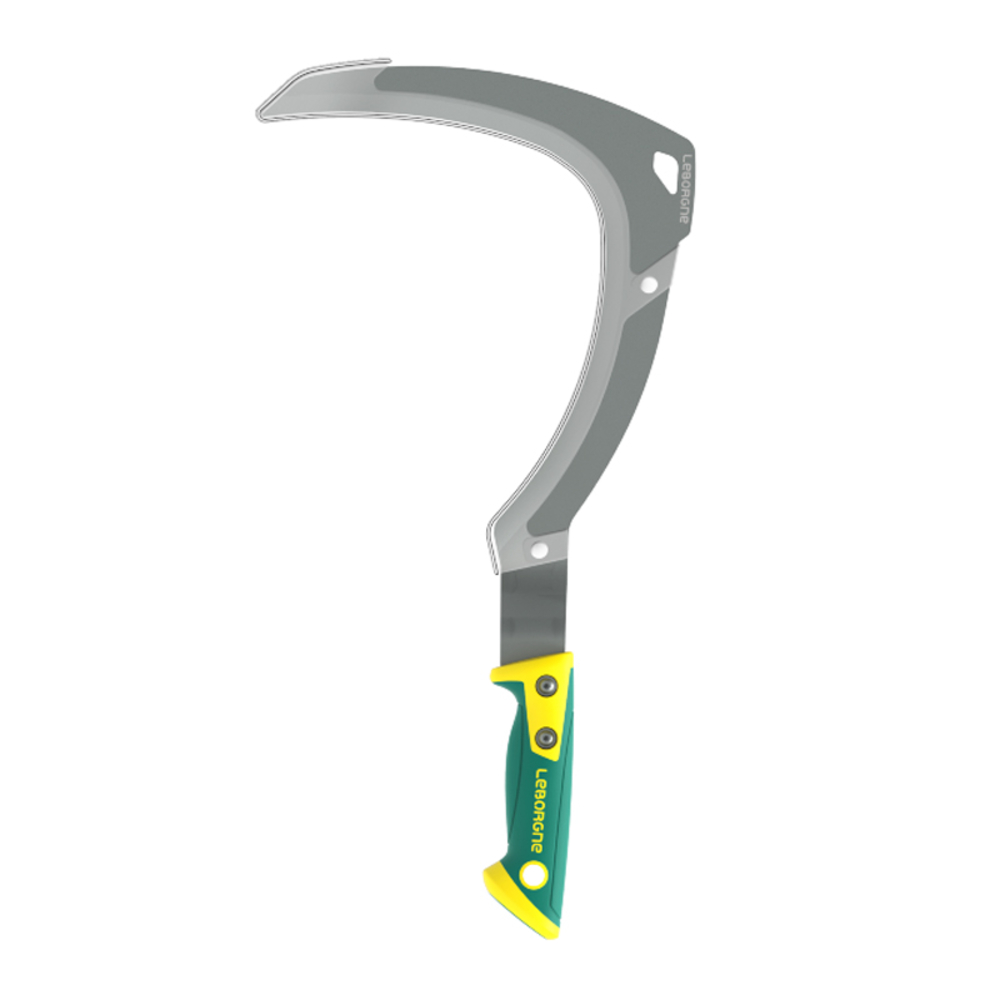 La conception coudée de la lame améliore la sécurité de l’utilisateur en réduisant les risques de blessure et en permettant une coupe au plus près du sol. Le manche bi-matière, renforcé de fibres de verre, intègre une garde et une butée anti-échappement pour un contrôle optimal. Son grip en élastomère anti-glissement assure une prise en main confortable et sécurisée, même en conditions difficiles.
