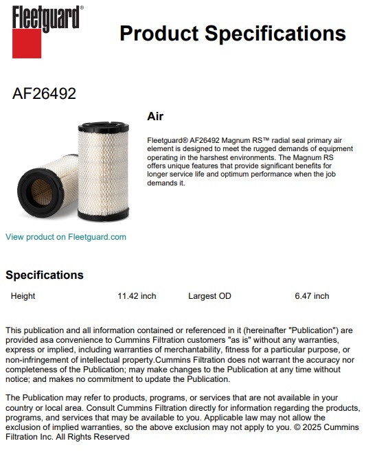 Le filtre à air Fleetguard AF26492, équivalent HIFI SC90039, offre une filtration efficace des impuretés, garantissant ainsi une performance optimale de votre moteur. Sa conception permet une installation simple et rapide, tout en assurant durabilité et longévité. Compatible avec plusieurs modèles, ce filtre est un choix judicieux pour maintenir la santé de votre moteur et optimiser son fonctionnement. Profitez d'une qualité de filtration supérieure pour une conduite sereine.