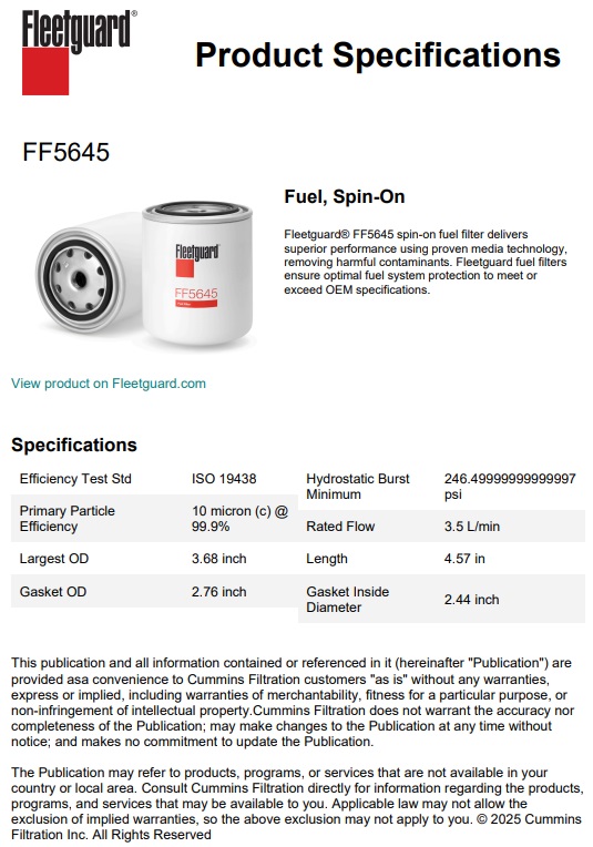 FILTRE A GAZOLE FLEETGUARD EQUIVALENT AU HIFI SN 70212