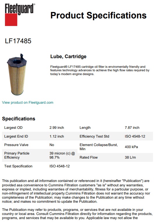 Découvrez FILTRE A HUILE FLEETGUARD LF17485 EQUIVALENT A HIFI SO 7213 disponible à l'achat