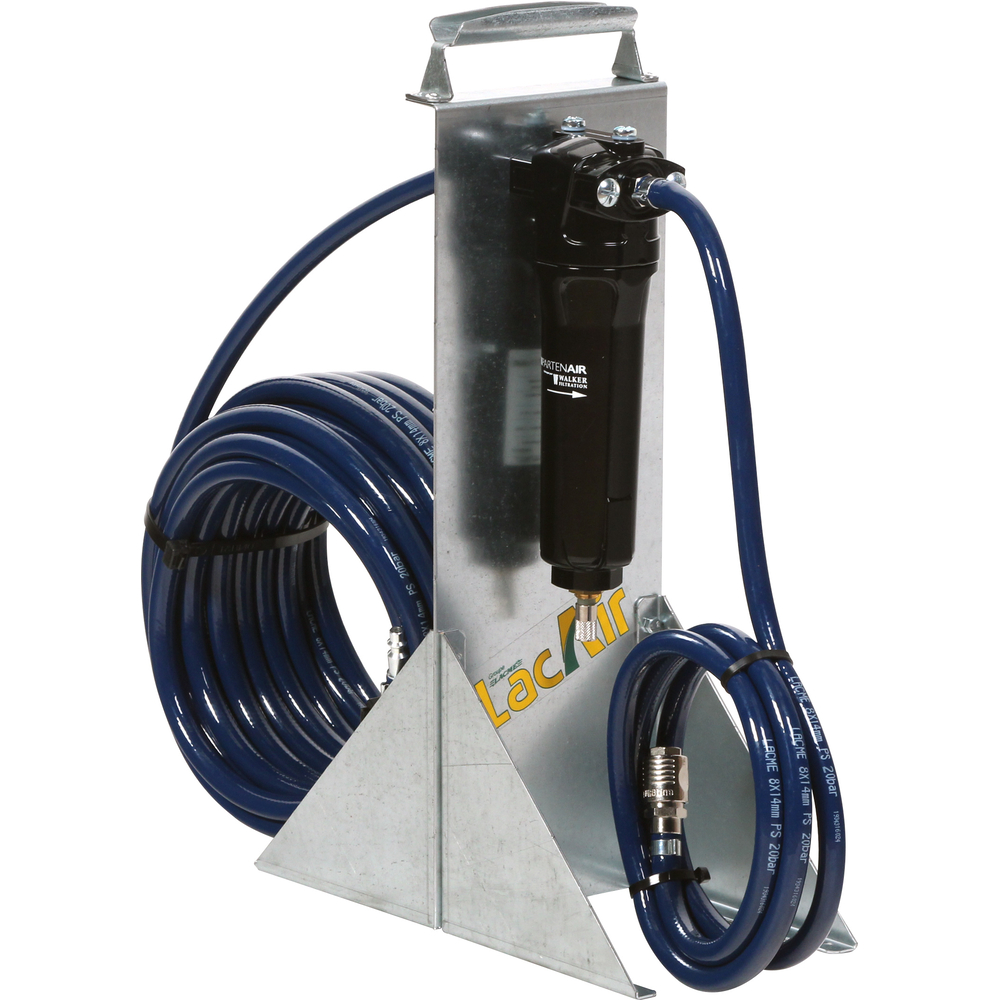 Débit maxi : 45 m³/h – Raccordement 1/4” – Tuyau 8 x 14 mm : 20 m + raccord rapide ISO – Indicateur de saturation – Purge auto à flotteur