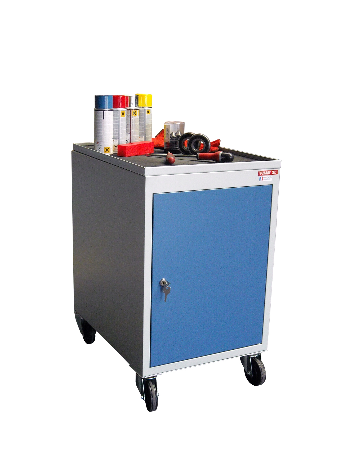 Permet d'avoir à porter de main ses outils dans un atelier. Plateau supérieur en tôle avec rebord de 30 mm pour éviter la chute d'outils. Équipé d'un tapis caoutchouc strié de forte épaisseur pour limiter les nuisances sonores. Blocs porte avec 1 étagère fournie et 1 jeu de 2 clés. En série, roues caoutchouc Ø 125 mm : 2 fixes + 2 pivotantes à frein. Autres types de bandage ou composition des roues présentés dans l'onglet des options.
