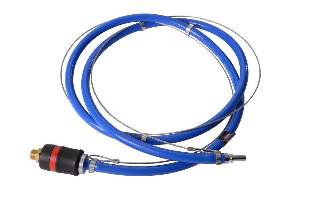 Flexible en polyuréthane de 1,70 m renforcé par un câble acier anti-fouet assemblé par plusieurs éléments de fixation sur toute la longueur.