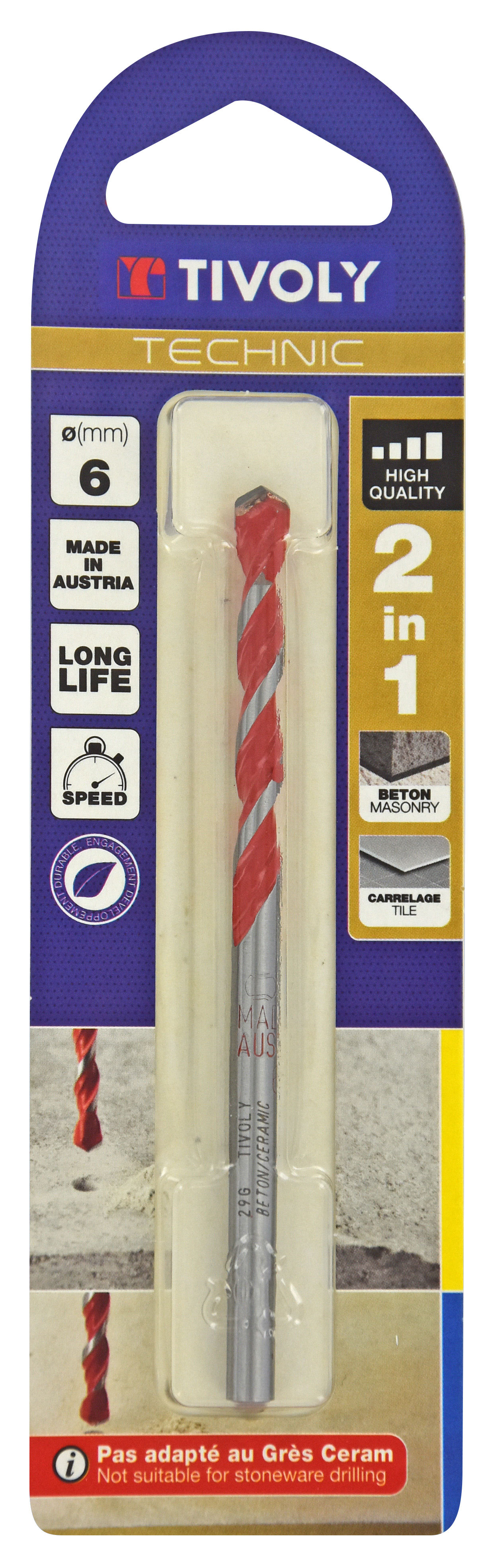 Foret 2 en 1 Bétons/Carrelages -Plaquette carbure affûtée -Goujures nervurées / L: 100 Ø: 6 TIVOLY - 10913020600