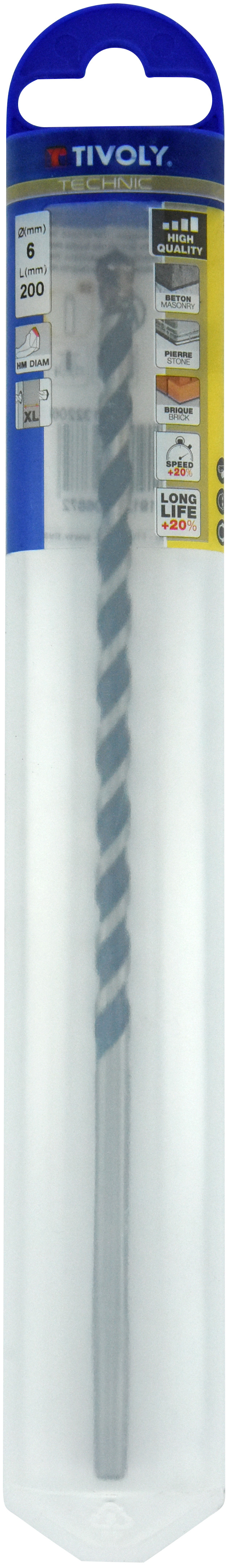 Foret bétons L200mm -Plaquette carbure affûtée diamant -Queue cylindrique / L: 200 Ø: 6 TIVOLY - 10913220600